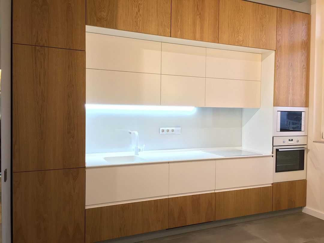 Для фасадов мы использовали практичный МДФ в двух форматах: под матовой белой эмалью и под натуральным шпоном. Такое цветовое сочетание привносит в интерьер мягкость, создает ощущение комфорта и тепла.